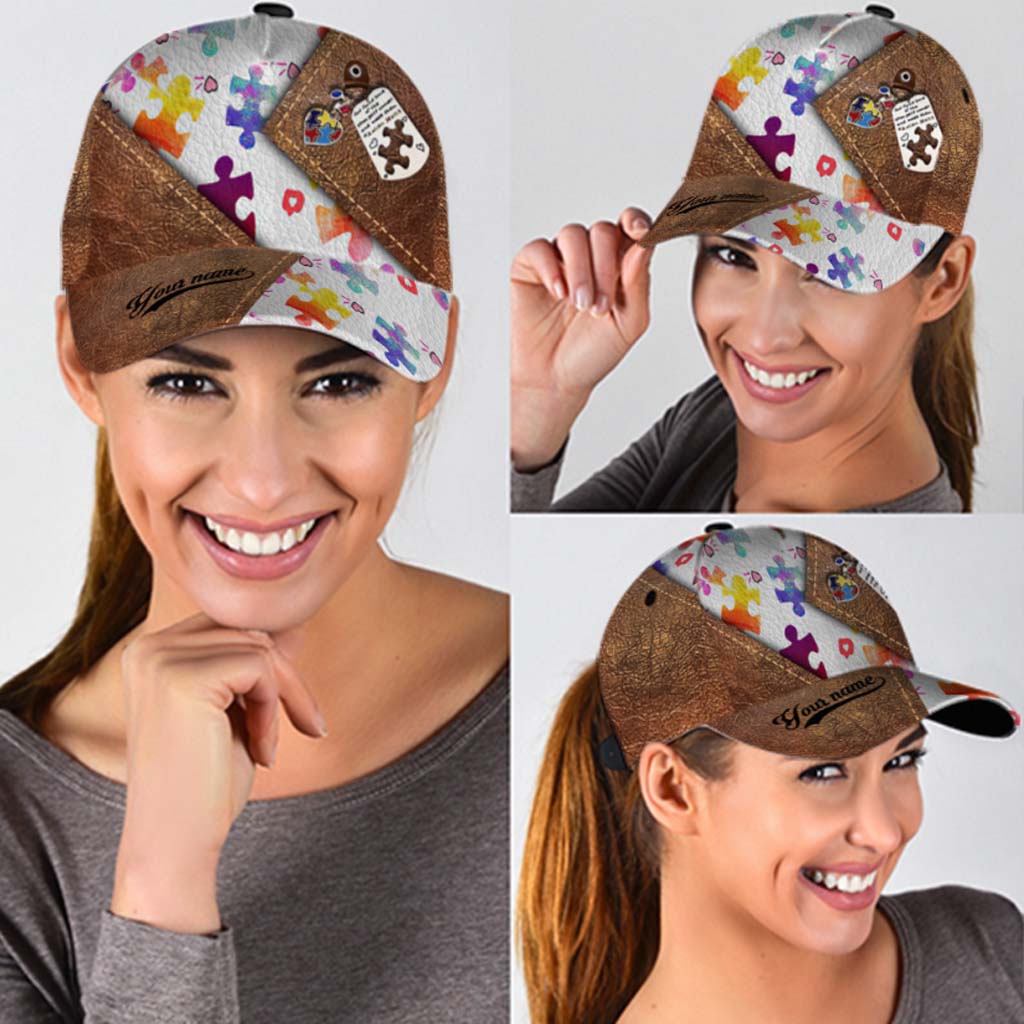 Personalisierte Lederkappe mit Musterprint und aufgedruckten Belüftungslöchern zur Sensibilisierung für Autismus