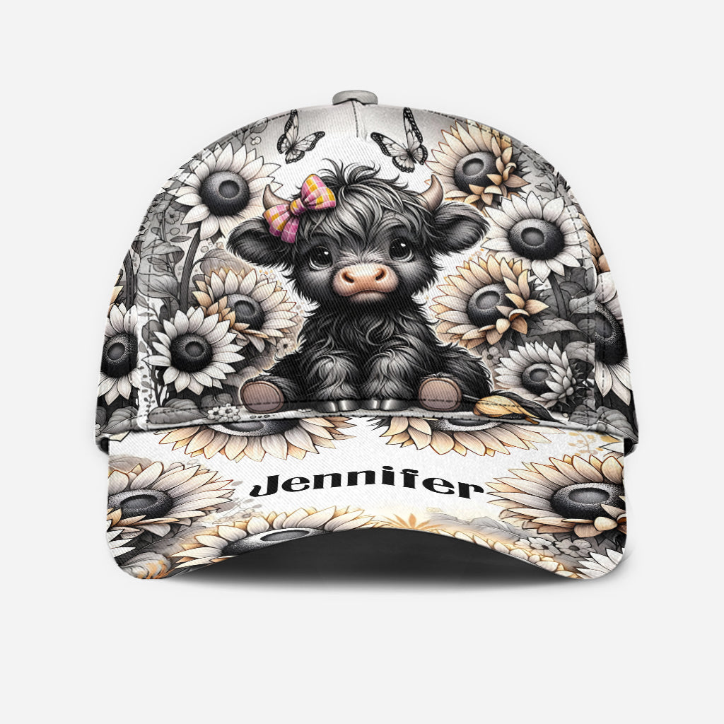 Schwarz-weiße Highland Cow Blume - Personalisierte Highland Cow Classic Kappe