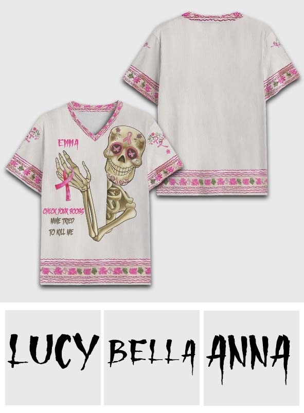 Check Your B, Mine Tried To Kill Me - Personalisiertes T-Shirt mit vollflächigem Aufdruck zur Brustkrebsvorsorge und V-Ausschnitt