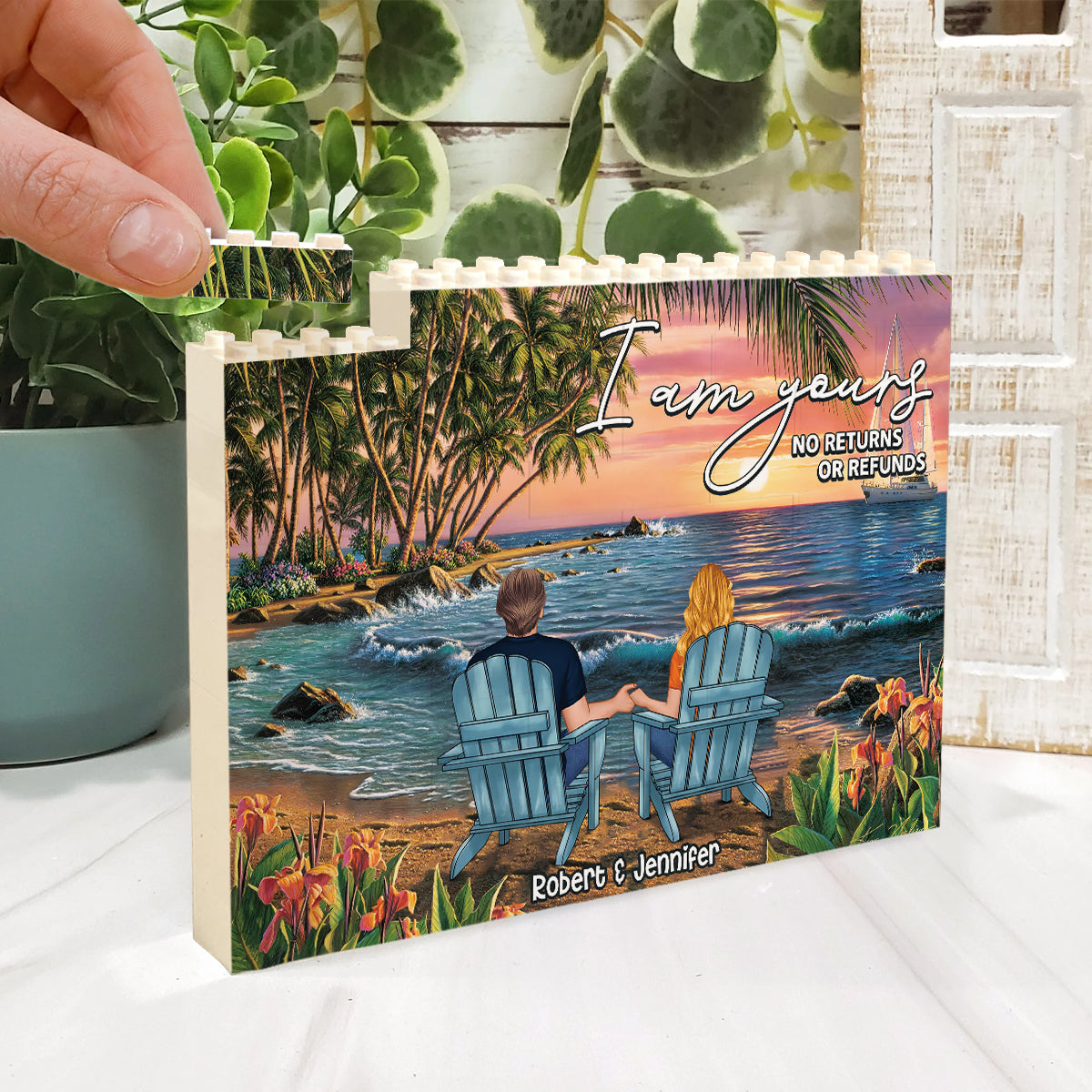 Paar-Strandlandschaft in tropischer Form - Personalisierte einseitige horizontale rechteckige Bausteine für Paare