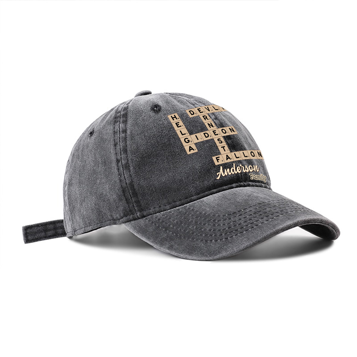 Scrabble-Kreuzworträtsel „Liebe Familie“ – Personalisierte Scrabble-Jeanskappe aus gewaschenem Denim