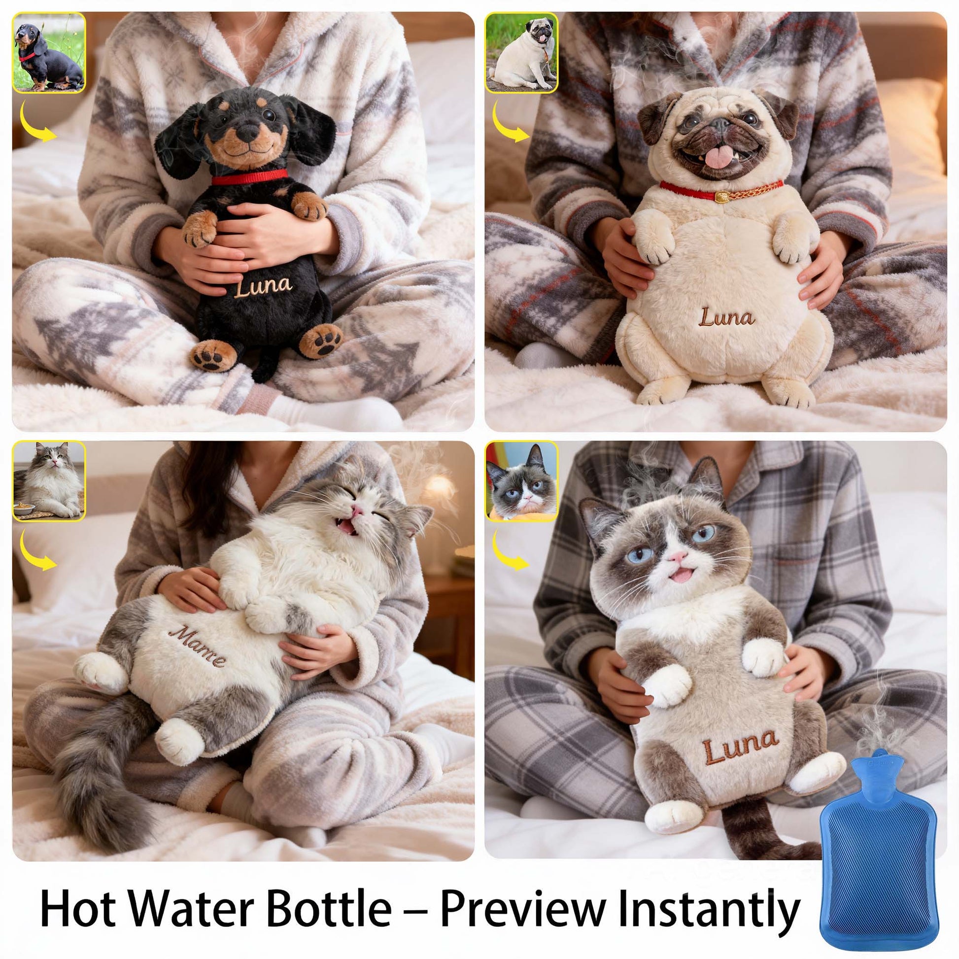 Individuell gestaltbare Wärmflasche mit Hundemotiv und Bezug – Foto nach Wunsch.