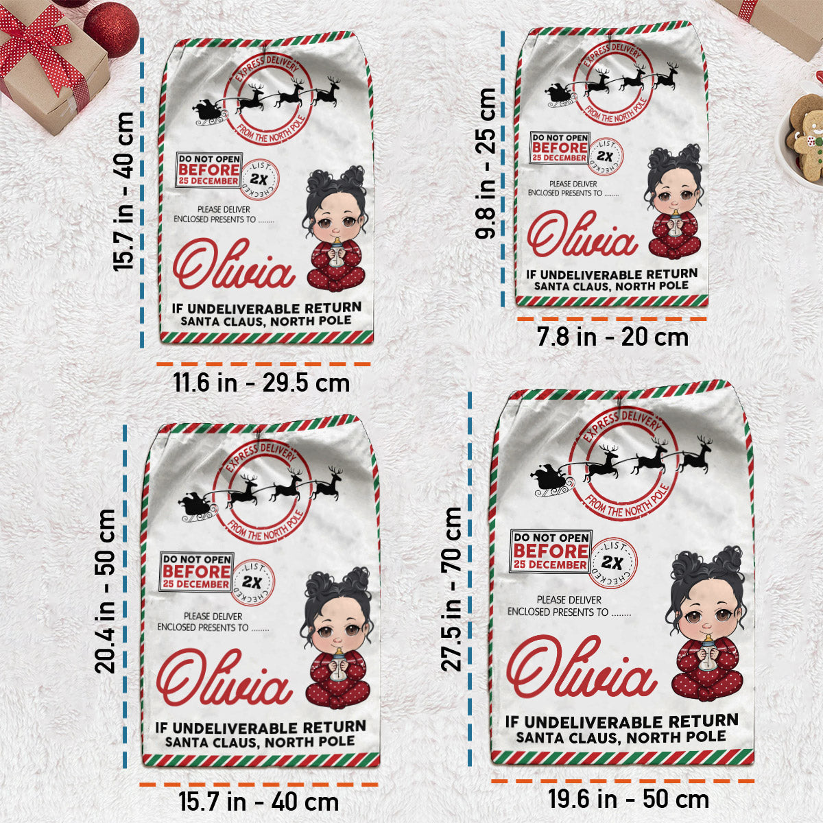 Diese wunderschöne, personalisierbare Wildleder-Tragetasche mit Kordelzug lässt sich mit jedem beliebigen Namen und Design individuell gestalten. Das Design wird direkt in den Stoff gedruckt und sorgt so für ein nahtloses, hochwertiges Finish. Die Tasche wird oben mit zwei Kordelzügen verschlossen, damit Ihre Sachen sicher verstaut sind. Sie eignet sich perfekt als Geschenk für Familie, Freunde, Kinder und besondere Menschen und verleiht Ihrer Weihnachtsbaumdekoration sowie dem Alltag eine persönliche Note. Befüllen Sie diese hübsche Tasche mit Weihnachtsgeschenken und legen Sie sie am Weihnachtstag unter den Baum oder personalisieren Sie sie als besondere Geschenktüte für Heiligabend.