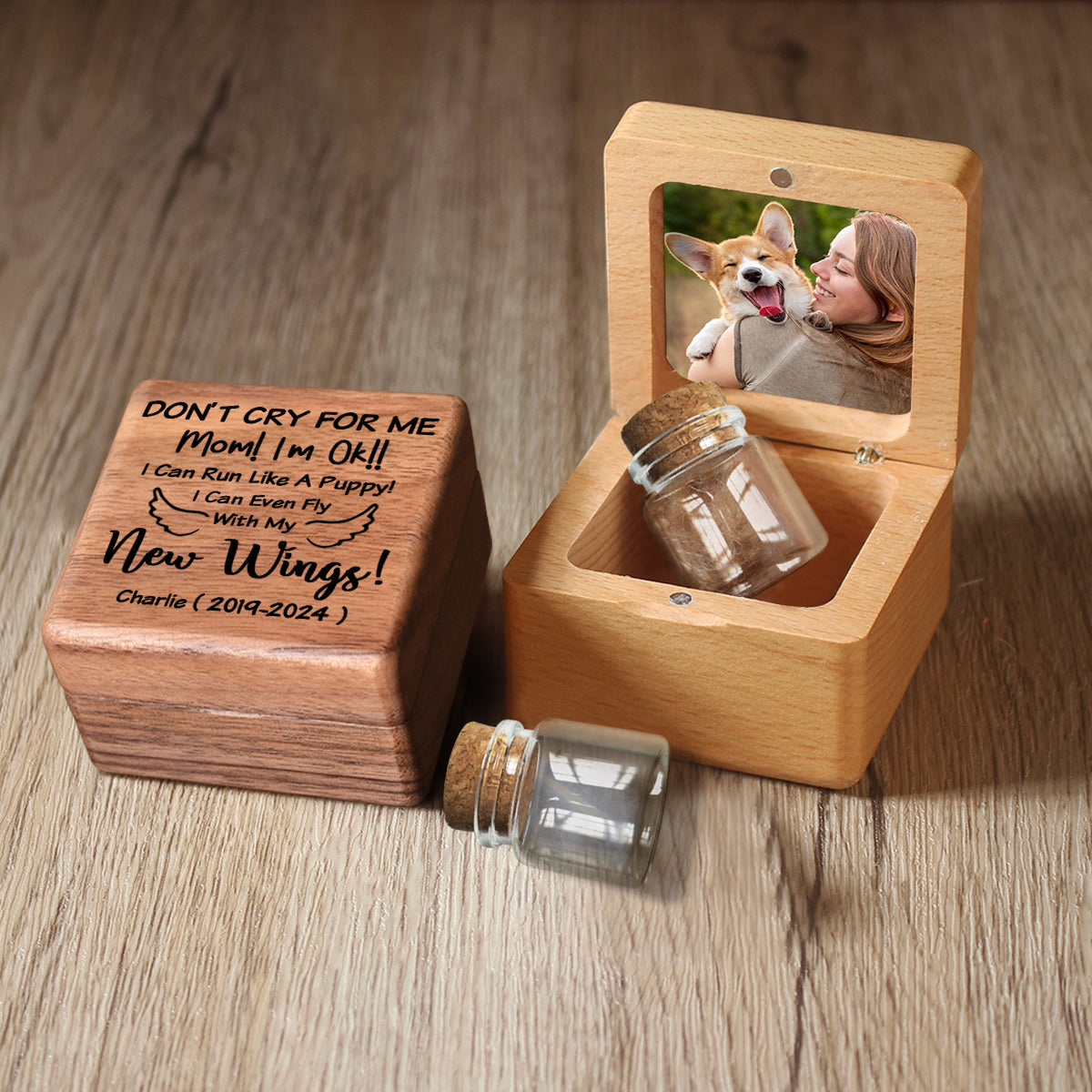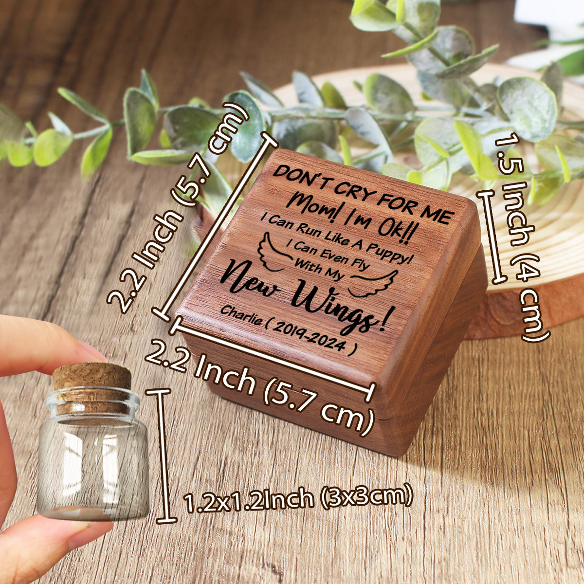 - Dieses personalisierte Erinnerungsstück aus Holz bietet Platz für Haare, Zähne oder andere kleine Andenken eines geliebten Haustiers. Es ist auch ein wunderbares Geschenk für Familienmitglieder oder Freunde, die ein geliebtes Haustier verloren haben.