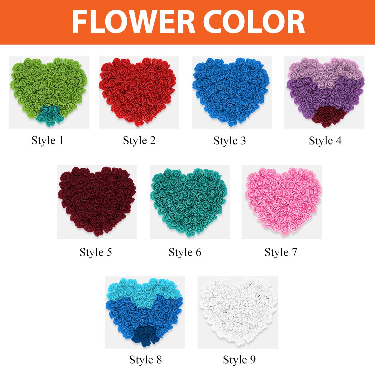 Diese herzförmige Blumen-Schattenbox enthält handgerollte PE-Schaumstoffblumen in verschiedenen Farbtönen.