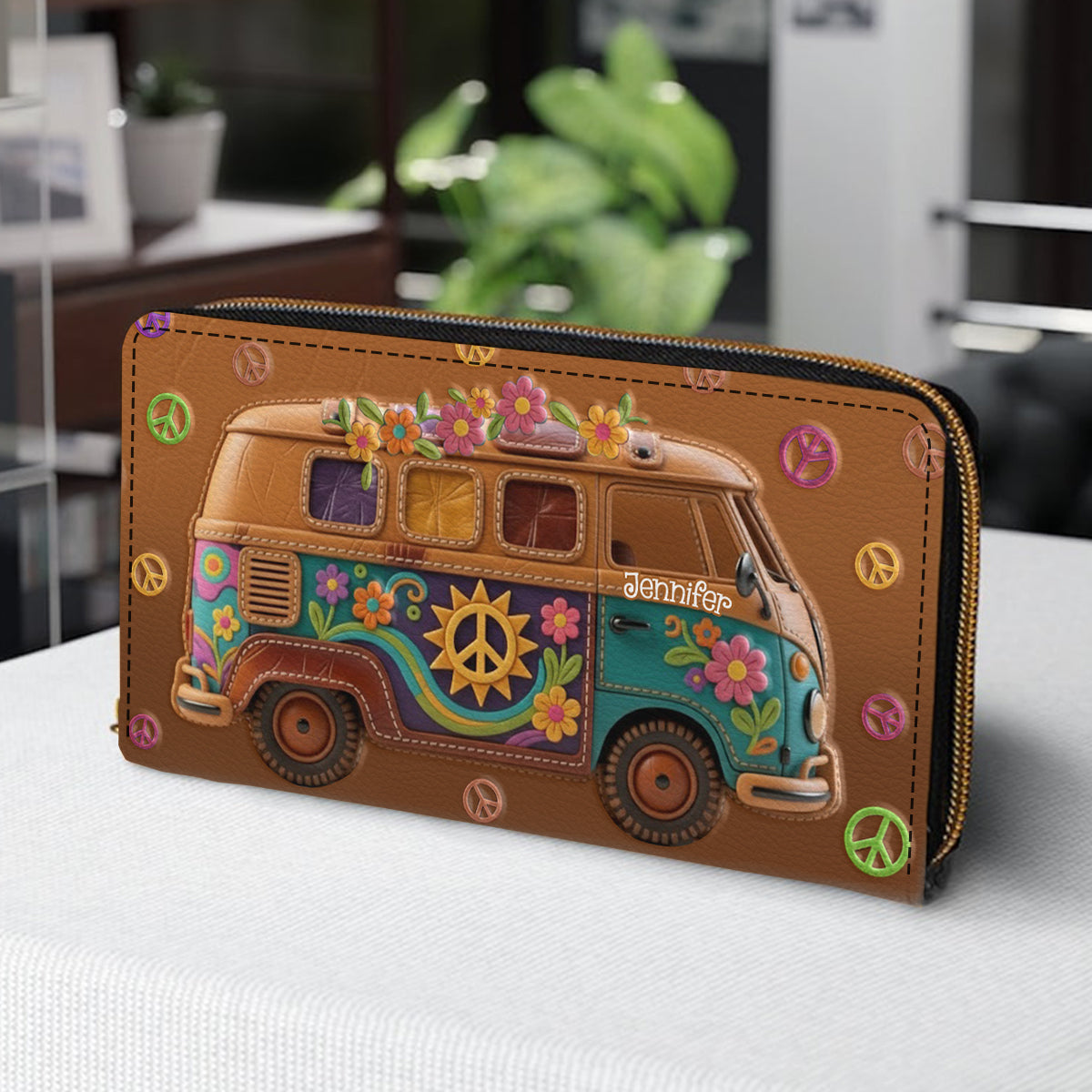 Floraler Hippie-Van – personalisierte Hippie-Ledergeldbörse
