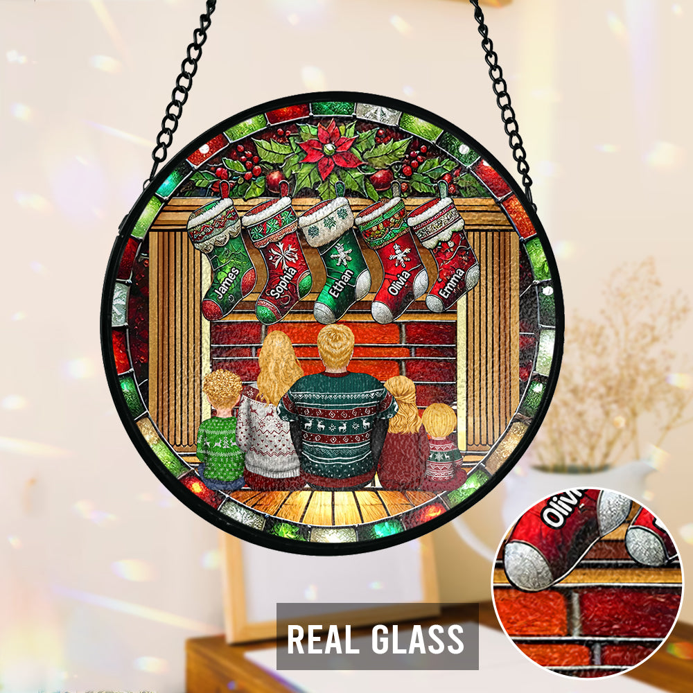 Glückliche Familie am Kamin – Personalisierter Familien-Sonnenfänger aus Buntglas