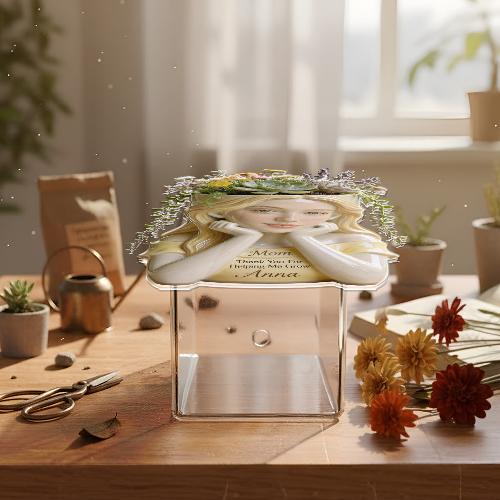 Enhance any space with this customizable acrylic pot, designed to combine function and personal style. The product includes a tall, clear acrylic pot paired with a custom-shaped acrylic front layer that showcases your personalized design.