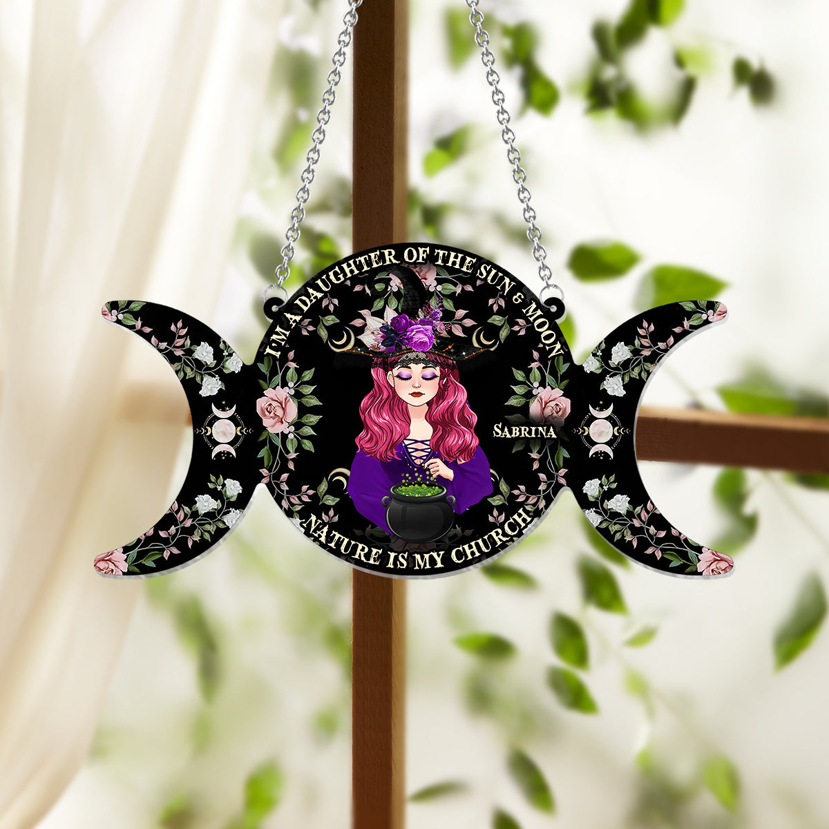 Ich bin eine Tochter von Sonne und Mond, die Natur ist meine Kirche – Personalisierter Hexen-Fensterhänger-Sonnenfänger