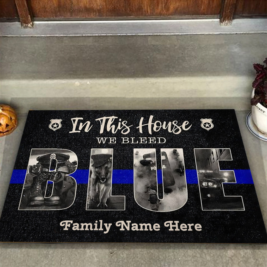 In diesem Haus bluten wir Blau – Personalisierte Fußmatte mit Polizeimotiv