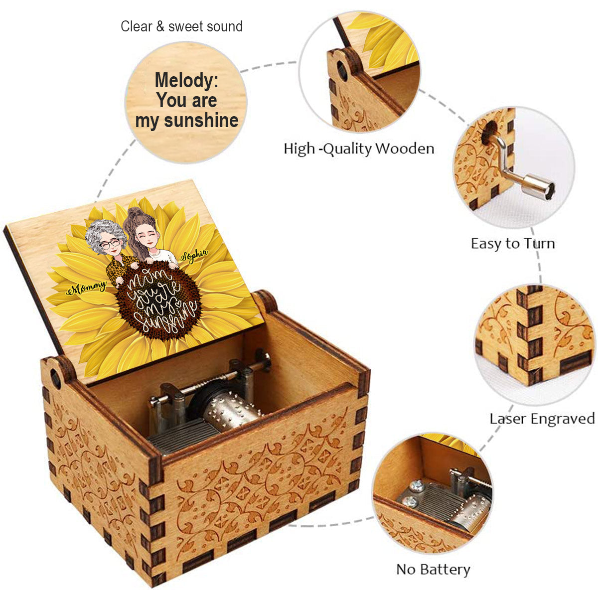Mama, du bist mein Sonnenschein – Personalisierte Muttertags-Spieluhr mit Handkurbel