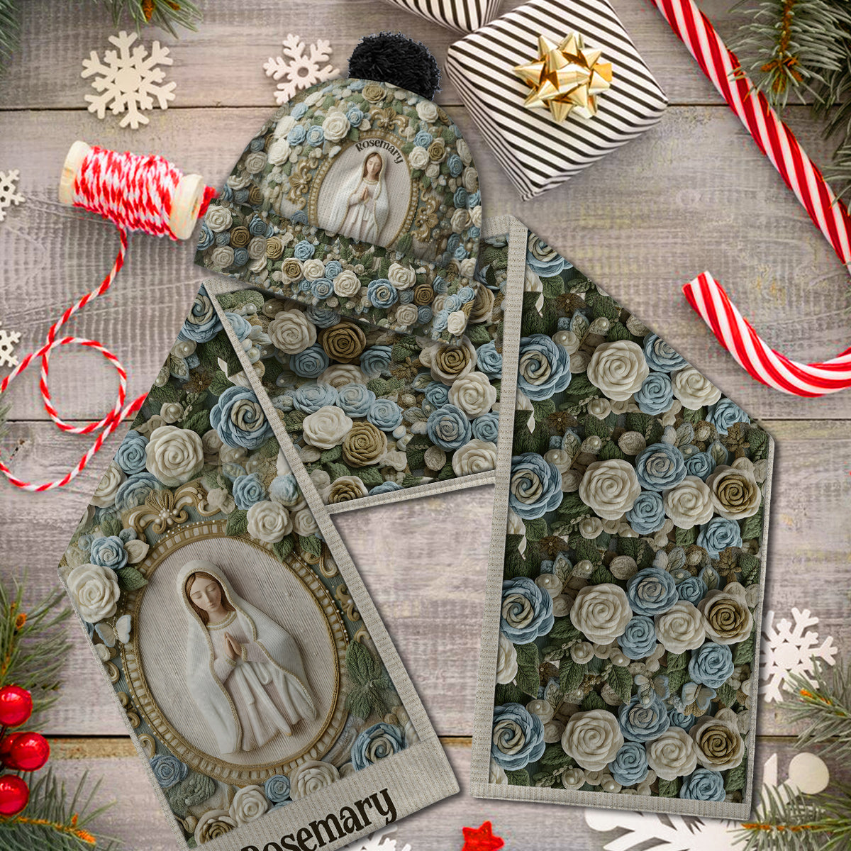 Unsere Liebe Frau Rose – Personalisiertes christliches Strickmützen- und Schal-Set