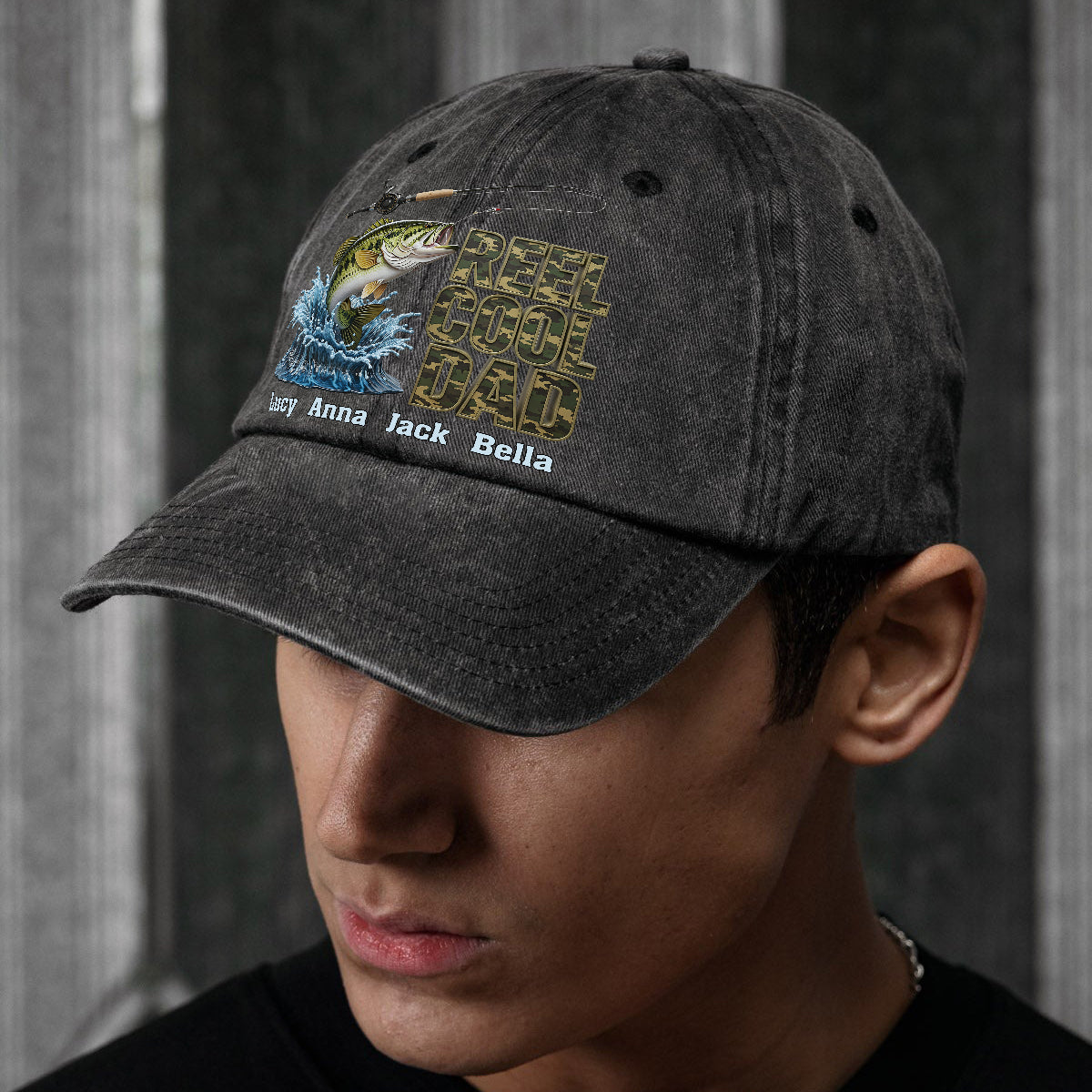Reel Cool Dad – Personalisierte Angel-Jeanskappe aus gewaschenem Denim