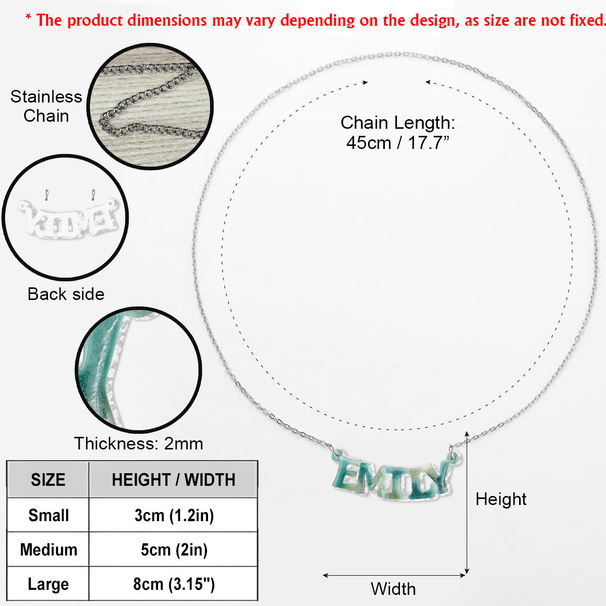 Verleihen Sie Ihrer Schmucksammlung eine persönliche Note mit unserer individuell geformten Anhängerkette. Gefertigt aus robustem Edelstahl, besticht sie durch langanhaltenden Glanz und Stil. Der Anhänger ist in drei Größen erhältlich – 3 cm, 4 cm und 8 cm – und verfügt über UV-Drucktechnologie für brillante, hochwertige Designs, die dauerhaft schön bleiben.