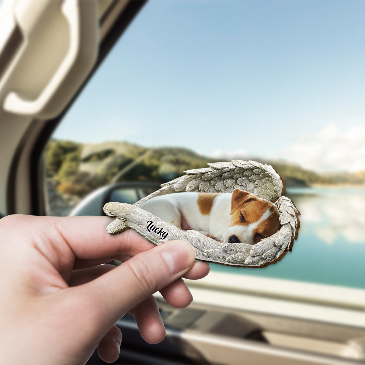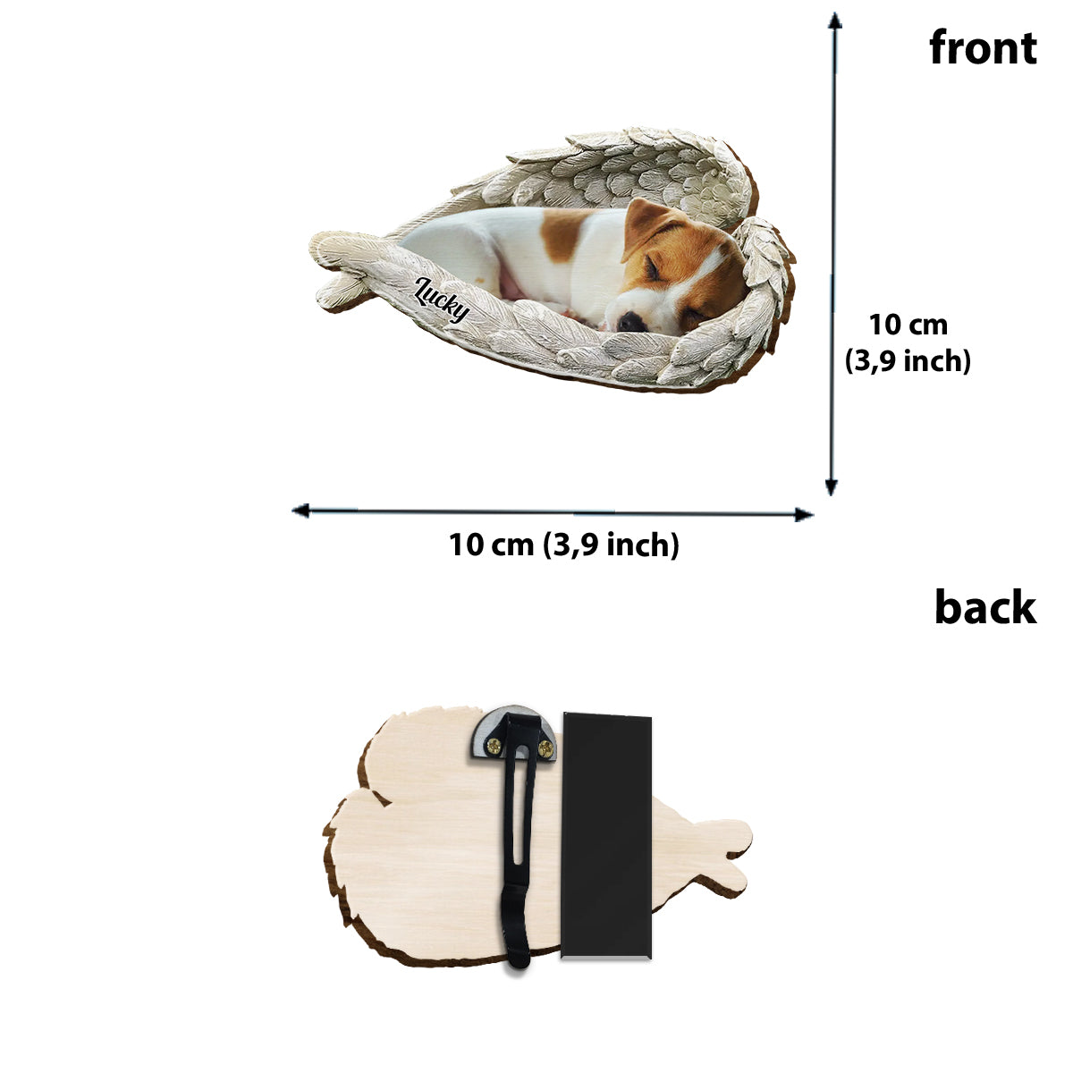 Schlafendes Haustier unter Engelsflügeln – Personalisierter Auto-Sonnenblendenclip in Hundeform