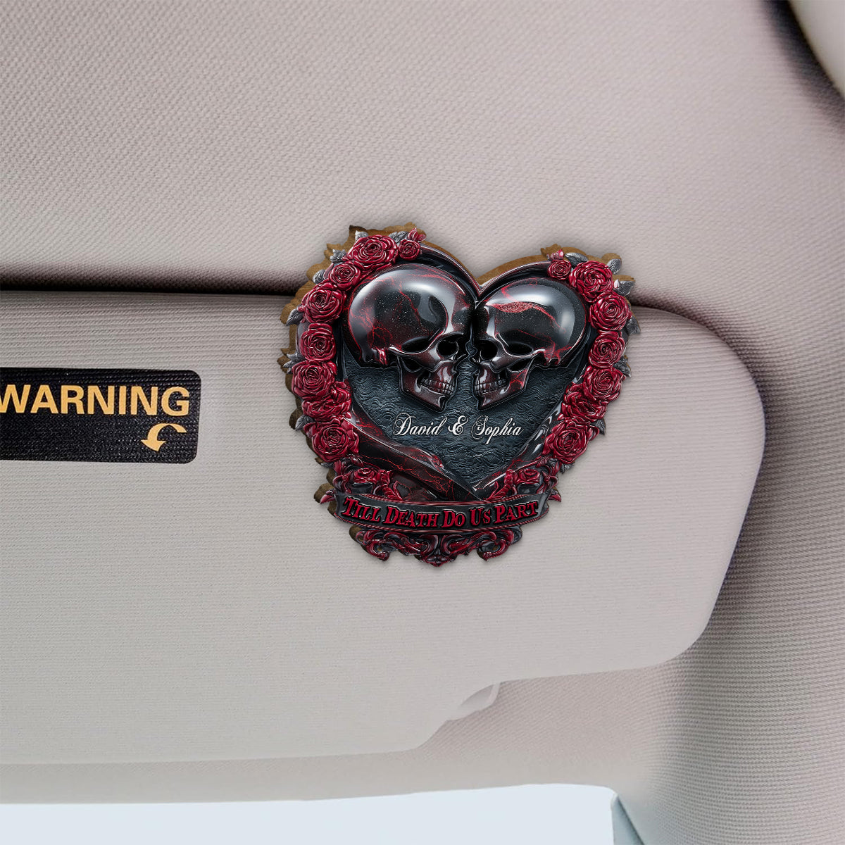Bis dass der Tod uns scheidet – Personalisierter Totenkopf-Sonnenblendenclip fürs Auto.
