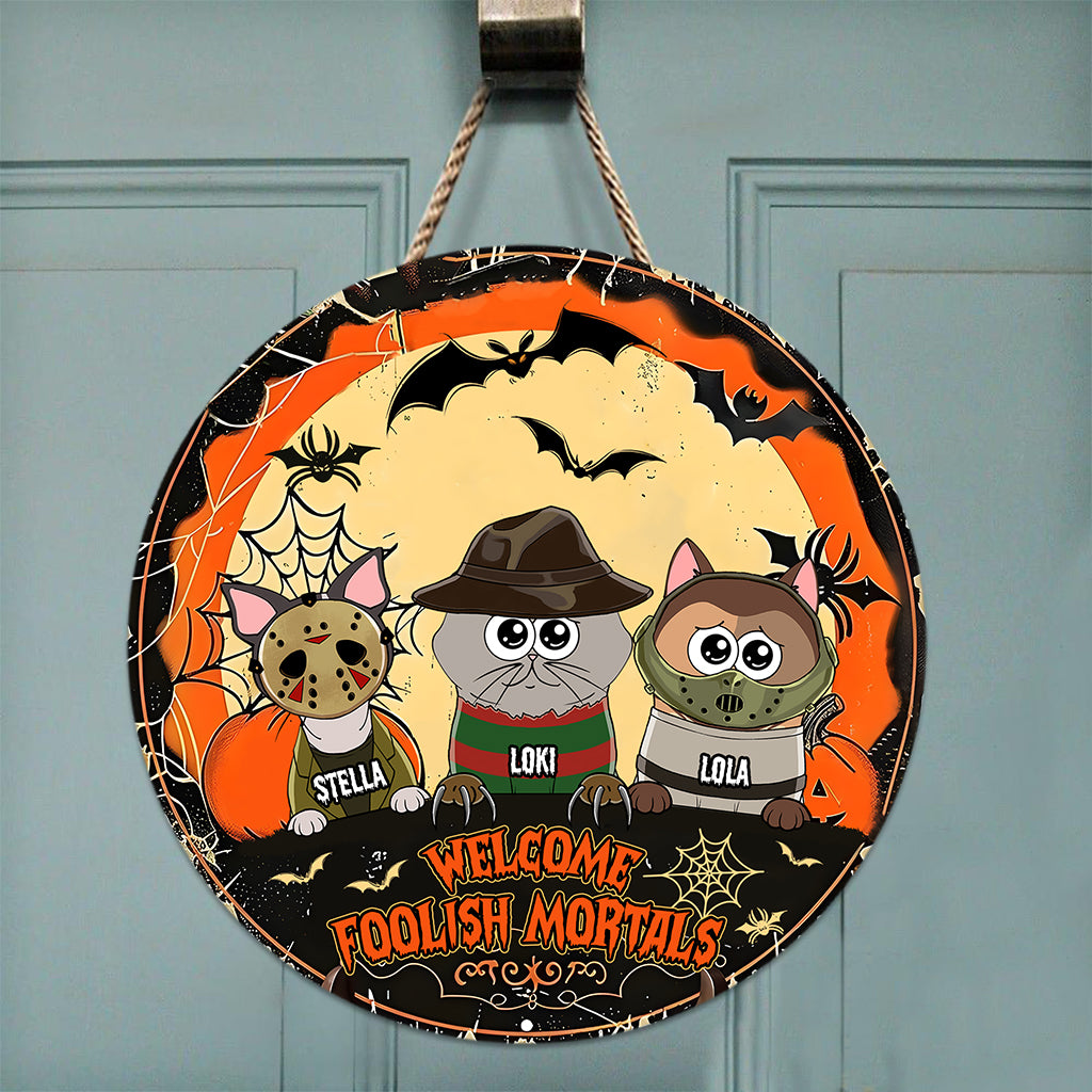 Willkommen, du törichter Sterblicher – personalisiertes rundes Holzschild mit Katze