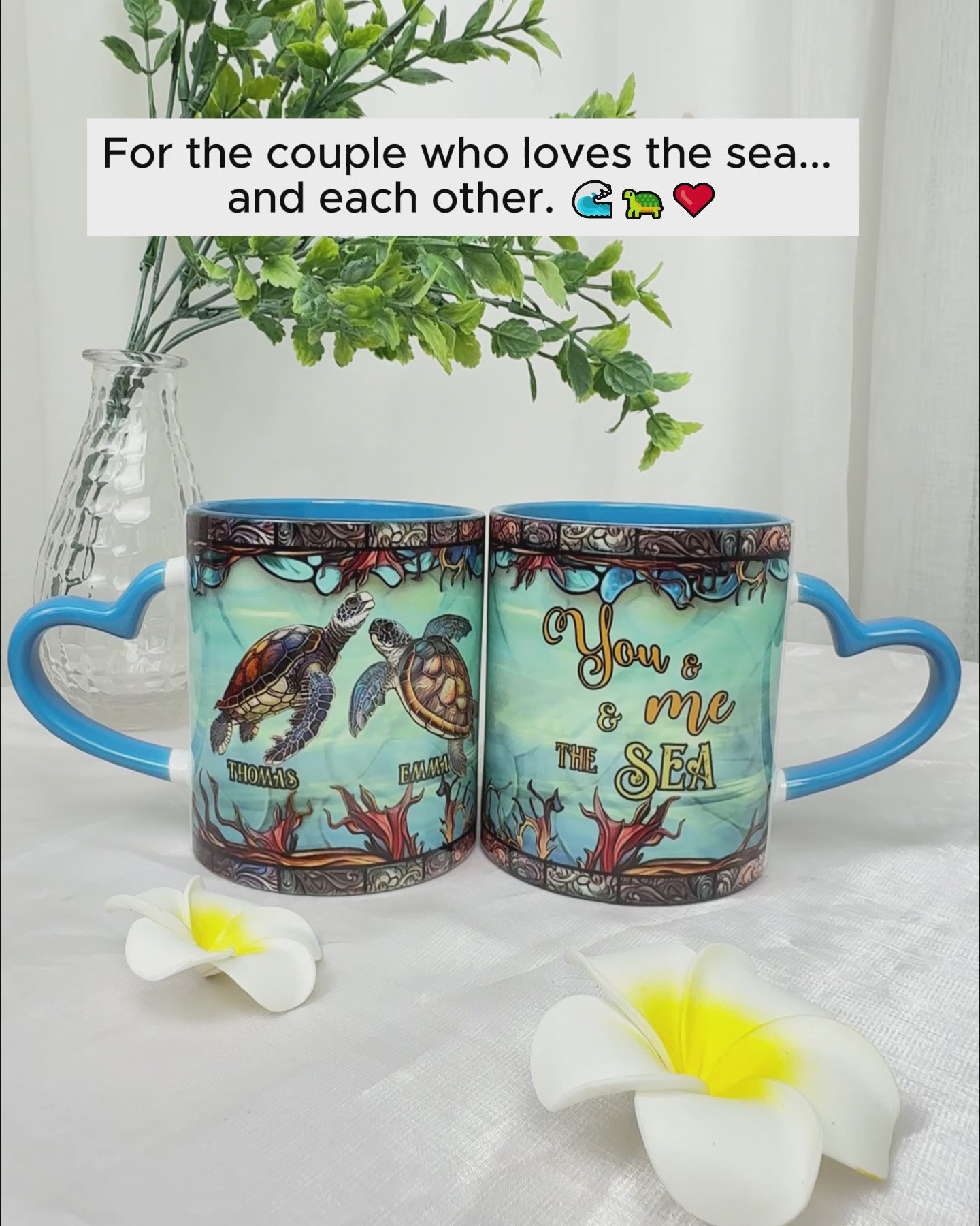 Du und ich und das Meer – Personalisierte Tasse mit Schildkrötenherz-Henkel